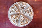 A sauceless pie topped with ricotta, mozzarella, and parmesan cheese.